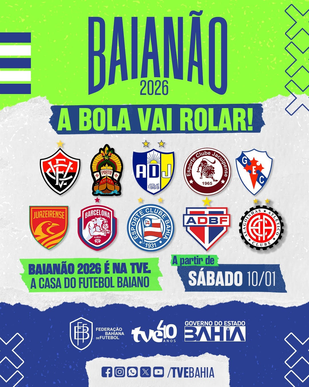 A disputa pela taça do Campeonato Baiano de Futebol de 2026 começa neste sábado (10), com transmissão exclusiva da TVE. Os 10 clubes que estão na disputa pelo título da primeira divisão são Atlético de Alagoinhas, Bahia, Bahia de Feira, Barcelona de Ilhéus, Galícia, Jacuipense, Jequié, Juazeirense, Porto e Vitória. Os torcedores podem acompanhar todos os jogos do Baianão ao vivo pela TVE e também pelo youtube.com/tvebahia.