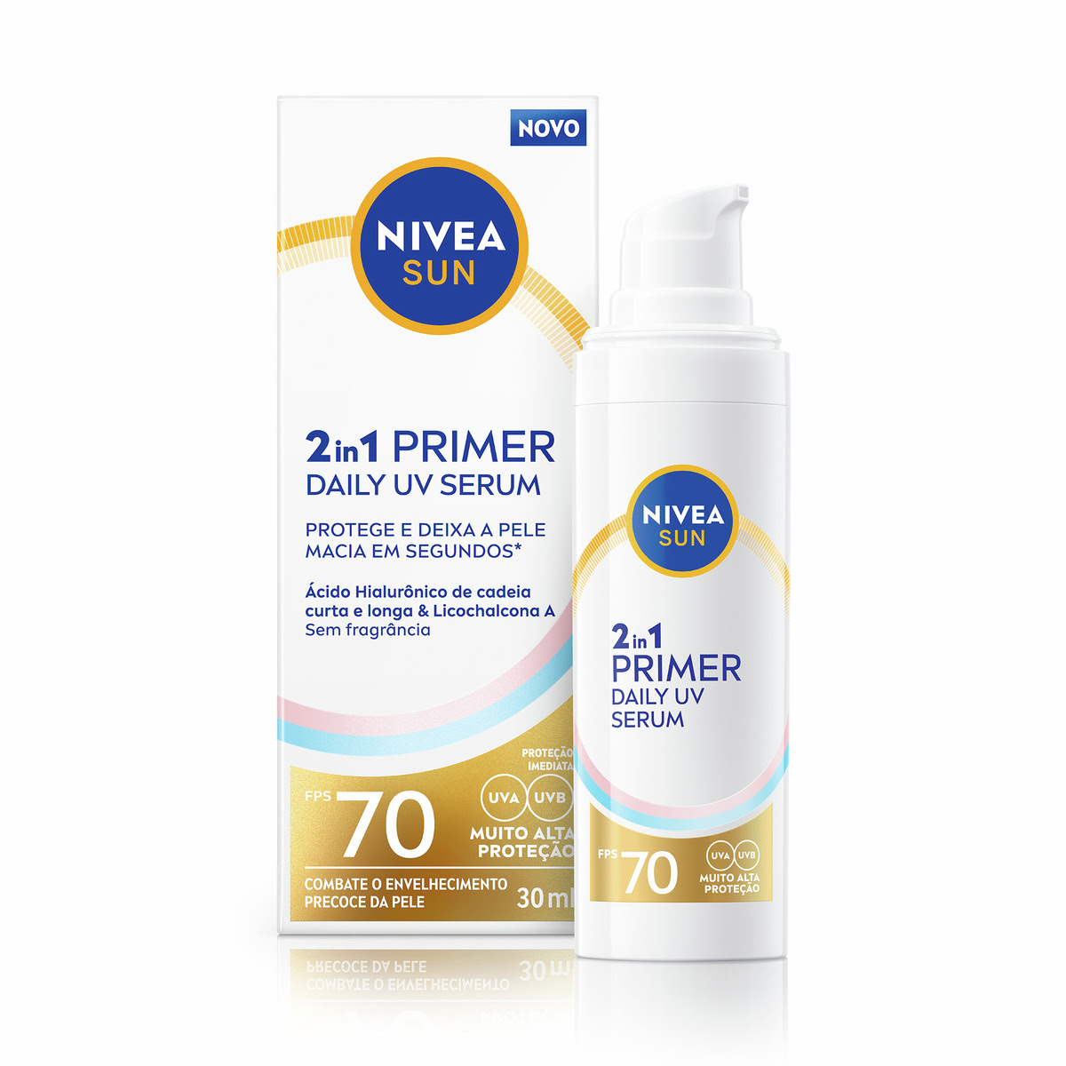 Combinando sua expertise em proteção solar ao olhar atento às tendências do mercado de beleza, NIVEA SUN, marca nº 1 em proteção solar no mundo**, lança o 2 em 1 Primer Daily UV Serum. Desenvolvido para quem busca praticidade, o novo produto reúne muito alta proteção solar com efeito primer, preparando a pele para uma maquiagem com acabamento impecável e duradouro.