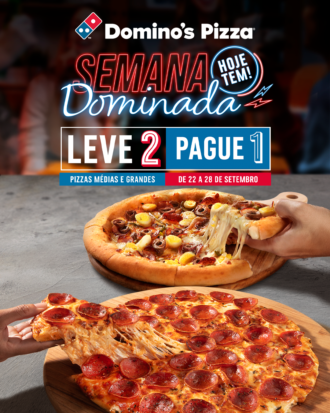 Na compra de duas pizzas médias ou grandes, a de menor valor sai por conta da Domino’s; Ação vai de 22 a 28 de setembro