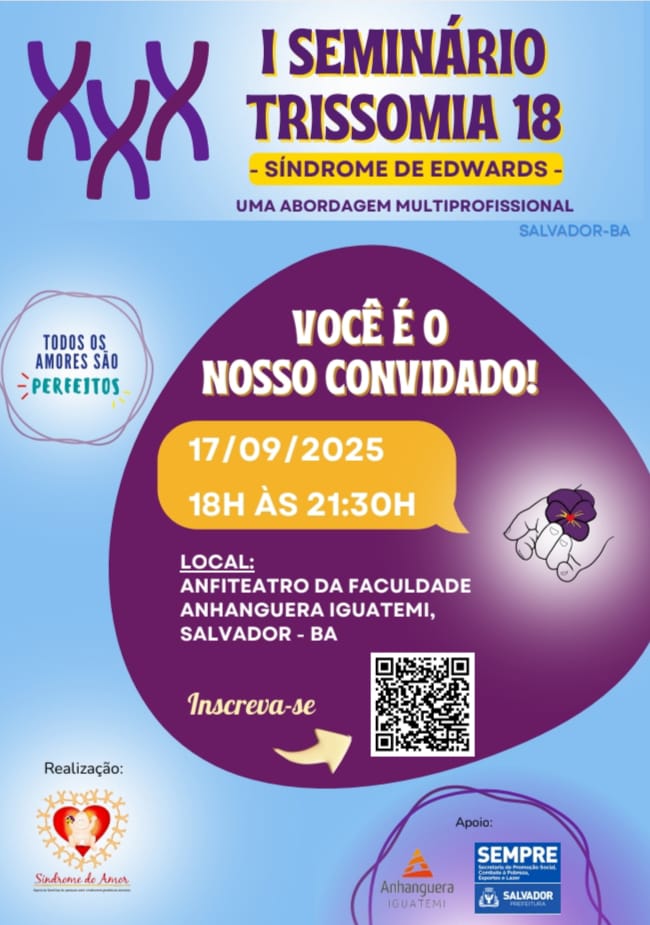A capital baiana sediará, na próxima quarta-feira (17/09), o 1º Seminário Trissomia 18 (Síndrome de Edwards), na Faculdade Anhanguera – Iguatemi. O evento marca um passo inédito na capital baiana ao promover um espaço de debate e conscientização sobre a Trissomia 18, condição genética rara causada pela presença de um cromossomo extra no par 18, que resulta em alterações no desenvolvimento e sérias complicações de saúde.