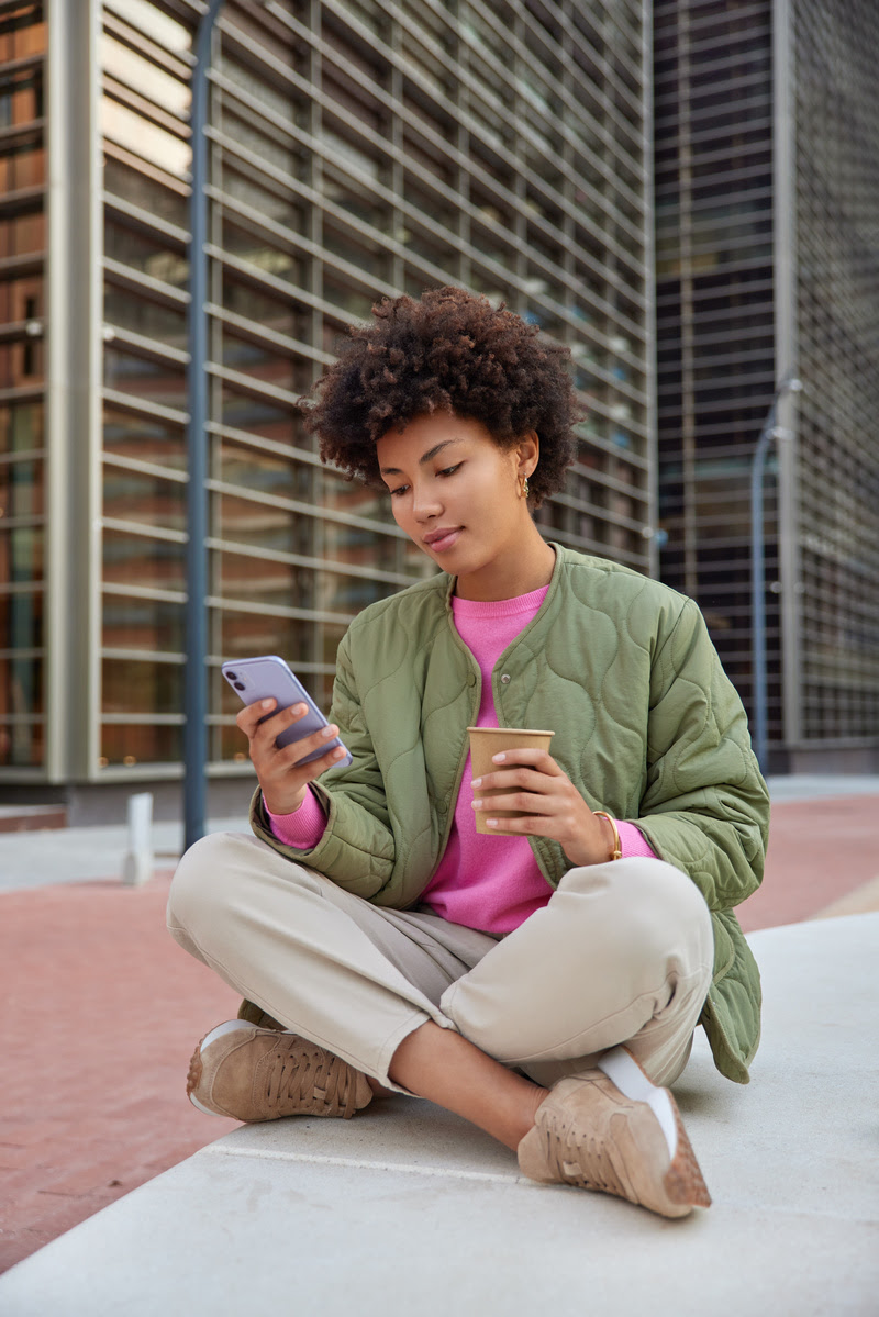 Relaxed curly haired young woman in casual wear sits crosses legs uses mobile phone communicates online posts information in social media drinks aromatic coffee from disposable cup poses outside