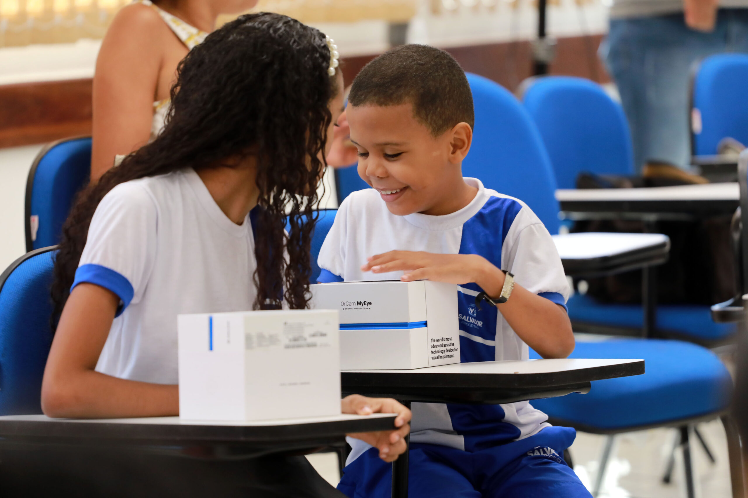 O Centro de Formação de Professores Emília Ferreiro, no Costa Azul foi palco, nesta segunda-feira (6), da entrega de óculos com tecnologia assistiva OrCam MyEye para 30 estudantes e 13 professores da rede municipal de ensino e do Instituto de Cegos da Bahia (ICB) com cegueira ou outro tipo de deficiência visual. O equipamento, que utiliza a tecnologia de visão artificial, a partir de uma câmera inteligente que faz a leitura em tempo real de textos, rostos, produtos, cores, códigos de barras e cédulas de dinheiro, atenderá a 122 alunos e profissionais com deficiência visual registrados na rede.