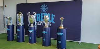 O Manchester City está fazendo um tour das taças da Tríplice Coroa conquistadas na última temporada europeia 2022/2023, que são da Copa da Inglaterra, a Premier League e a Champions League, além dos troféus do Mundial de Clubes 2013, vencido em dezembro, e da Supercopa da Europa, abocanhada na última sexta (5). Chamado de Treble Trophy Tour, o evento aconteceu nesta quarta em Salvador, feito em ação conjunta com o Bahia, clube que faz parte do Grupo City. Nesta sexta (12) e sábado (13), os troféus serão exibidos em São Paulo, na Beach Arena Real Parque, no bairro do Morumbi.