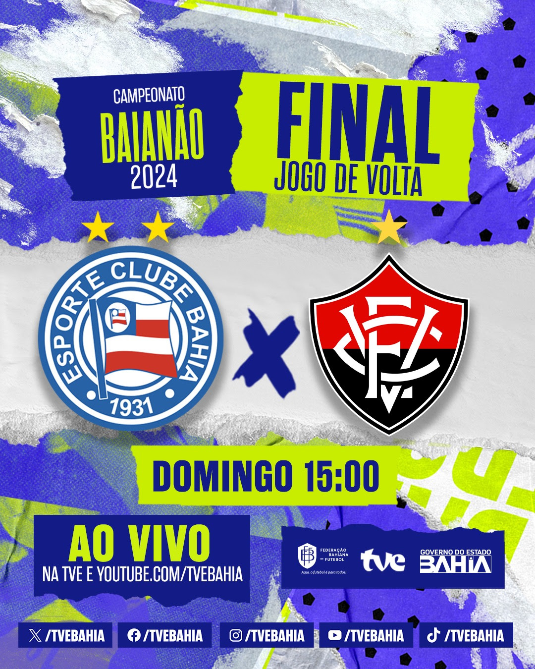Bahia e Vitória se enfrentam no jogo de volta da final do Campeonato Baiano, com transmissão ao vivo e exclusiva da TVE, direto da Arena Fonte Nova, neste domingo, a partir de 15h (pré-jogo). A partida, que vale o título do estadual baiano, será transmitida também para todo o País pela TV Brasil, e os torcedores ainda podem acompanhar tudo pelo canal da TVE no youtube, no link youtube.com/tvebahia.
