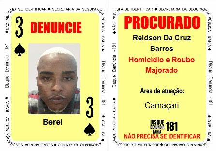 Apontado como braço direito de um líder de uma organização criminosa, preso em maio num apartamento de luxo avaliado em R$ 5 milhões no estado de São Paulo, Reidson da Cruz Barros, o ‘Berel’ é o novo integrante do Baralho do Crime da Secretaria da Segurança Pública da Bahia (SSP-BA). Criminoso passa a integrar a carta 3 de Espadas da ferramenta na manhã desta quinta-feira (7).