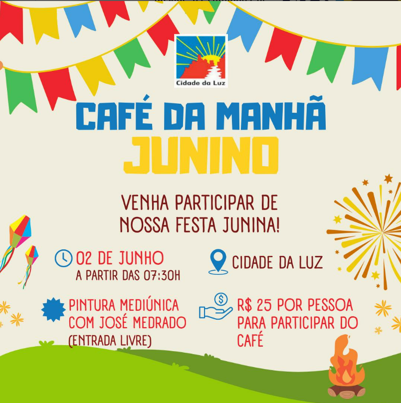 A Cidade da Luz, instituição com 46 anos de existência focada no propósito de promover o Bem, realiza o seu Café da Manhã Junino, neste domingo, 02 de junho, a partir das 07h30. Além de uma manhã repleta de alegria e a possibilidade de saborear comidas deliciosas, os presentes terão a oportunidade de conhecer uma sessão de pintura mediúnica que será conduzida por José Medrado, fundador da Cidade da Luz.