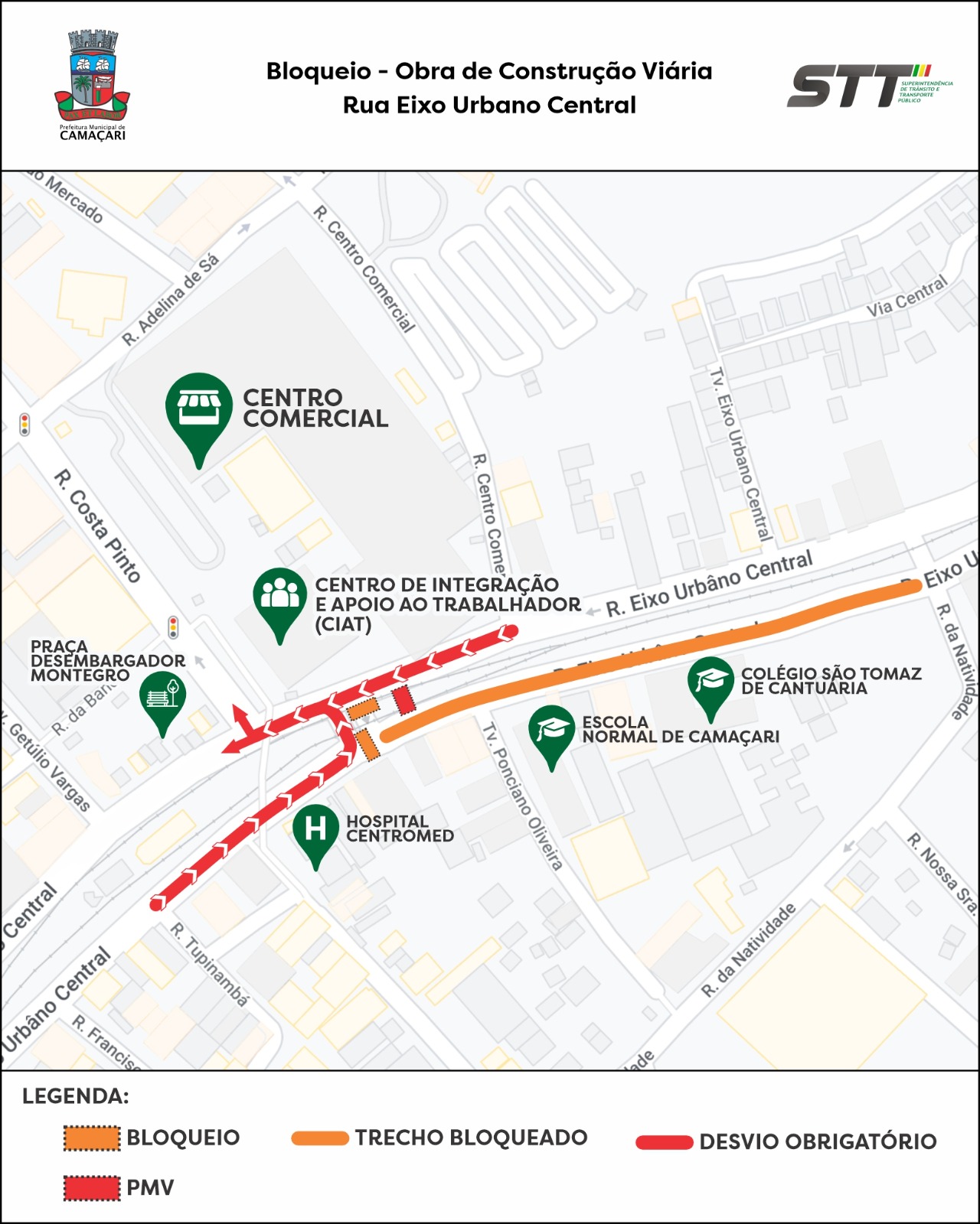 A partir deste domingo (4/8), o trecho compreendido entre a Travessa Ponciano de Oliveira e a Rua da Natividade, no sentido do bairro Natal, no Centro, será bloqueado temporariamente. O motivo é a execução de nova etapa das obras de requalificação da Avenida Eixo Urbano Central, realizada pela Prefeitura de Camaçari, por meio da Secretaria da Infraestrutura (Seinfra). A previsão de início do serviço é na segunda-feira (5).