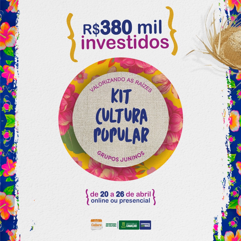 O Concurso Cultural kit Cultura Popular – 3ª Edição, destina-se a reconhecer, valorizar e premiar a atuação de Grupos de Cultura Popular de Camaçari, responsáveis pela transmissão e perpetuação de saberes, celebrações e formas de expressão que compõem o patrimônio cultural imaterial do município, em toda a sua diversidade, a fim de cumprir as metas e diretrizes do Plano Municipal de Cultura, bem como do Programa Cultura Todo Dia.