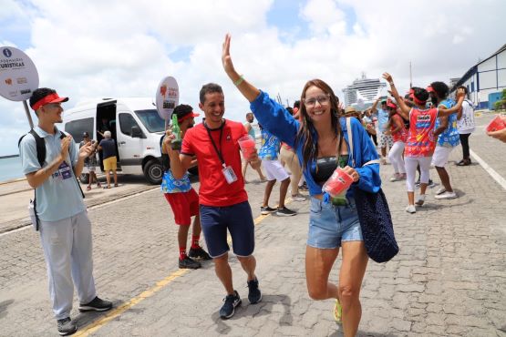 Cerca de 12 mil turistas desembarcaram dos navios de cruzeiro Grandiosa e Mediterranean, do grupo MSC, no porto de Salvador, na segunda (12) e terça-feira (13) de Carnaval, respectivamente. Eles vieram aproveitar os últimos dias da folia e tiveram receptivo especial da Secretaria de Turismo do Estado (Setur-BA), com microtrio elétrico, recreadores e baianas típicas. O órgão também disponibilizou a confecção de turbantes afro-baianos, além de informações sobre a programação da festa, atrativos turísticos da cidade e serviços essenciais.