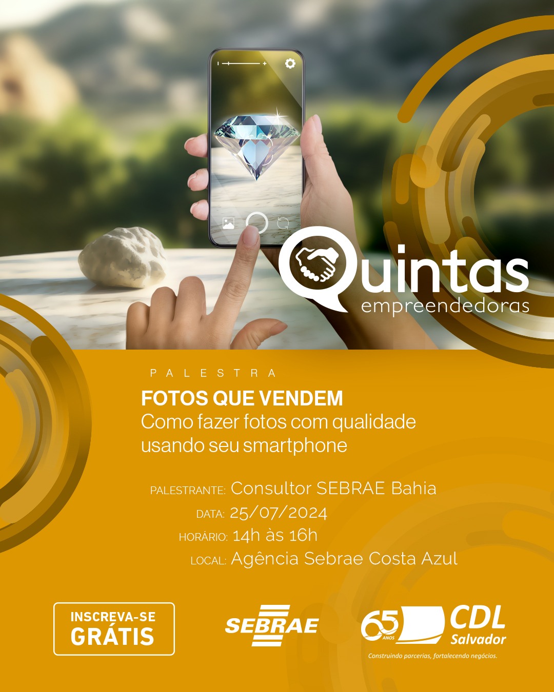 Nesta quinta-feira (25), a partir das 14h, a CDL Salvador e o Sebrae Bahia realizam mais uma edição do Quintas Empreendedoras. O evento gratuito terá como tema o workshop “Fotos que vendem”, e tem como objetivo orientar lojistas, vendedores e pessoas ligadas ao comércio varejista a registrarem imagens de qualidade dos produtos que estão à venda.