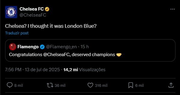 No X (antigo Twitter), a conta oficial do Flamengo em inglês parabenizou o Chelsea pela conquista. A resposta dos Blues, porém, veio com ironia: “Chelsea? Não era London Blue?”, publicou o perfil do clube londrino.