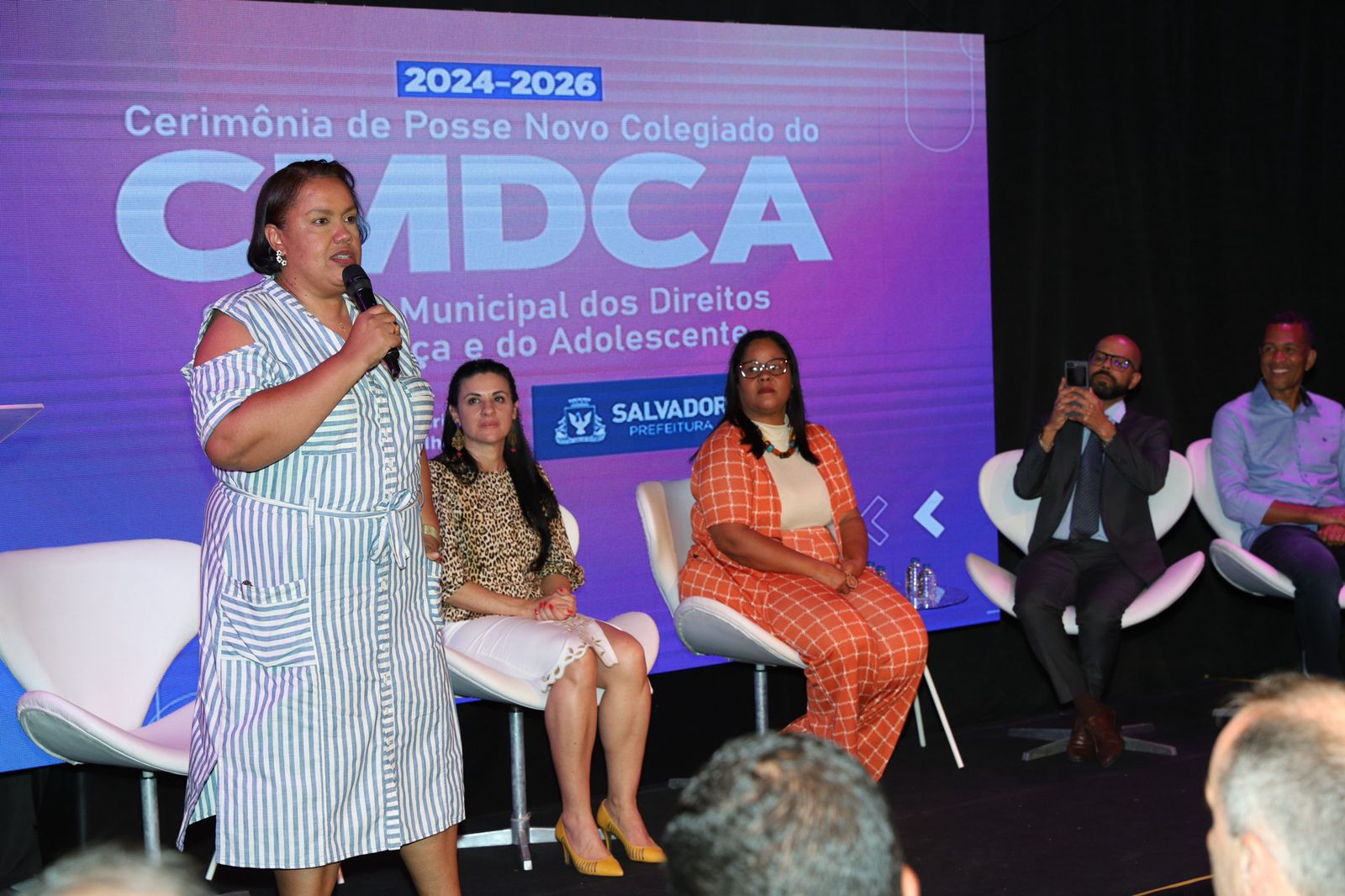 A cerimônia de posse da nova presidente do Conselho Municipal dos Direitos da Criança e do Adolescente (CMDCA), Dinsjani Pereira, ocorreu na tarde desta quarta-feira (30), no Teatro Gregório de Mattos, localizado na Praça Castro Alves, em Salvador. Ela assume a liderança do conselho para o mandato 2024-2026, sucedendo Leu Brasil, que agora ocupa a vice-presidência.