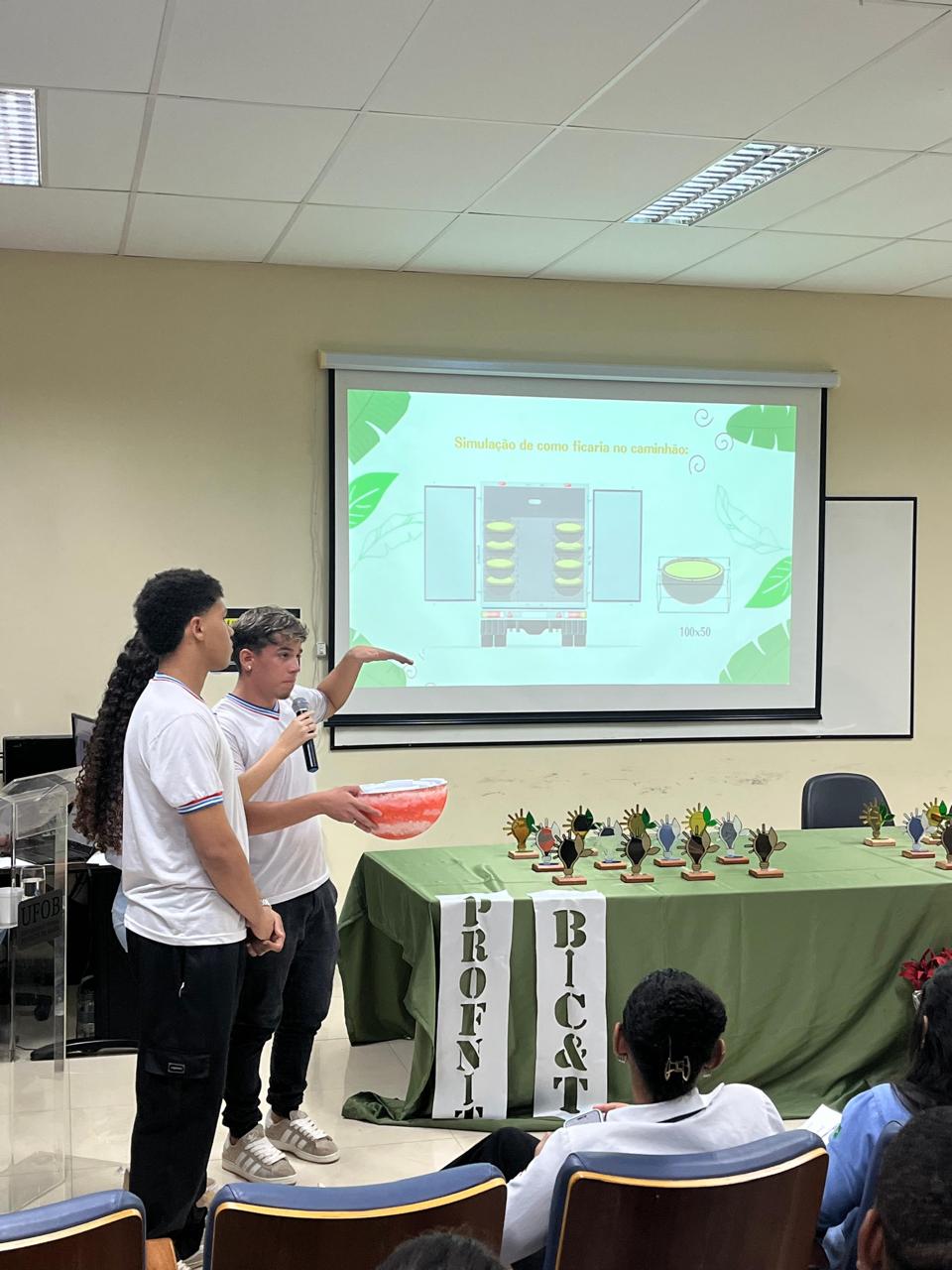 O primeiro lugar ficou com o projeto “Prato giratório anti-impacto para o transporte de bananas”. A equipe reuniu Gustavo Muniz de Carvalho, Erick Henrique do Nascimento de Souza e Laisla Ribeiro da Silva, todos com 17 anos, da 3ª serie do Wnsino Médio. Além do troféu, os estudantes ganharam três bolsas do Conselho Nacional de Desenvolvimento Científico e Tecnológico (CNPq).