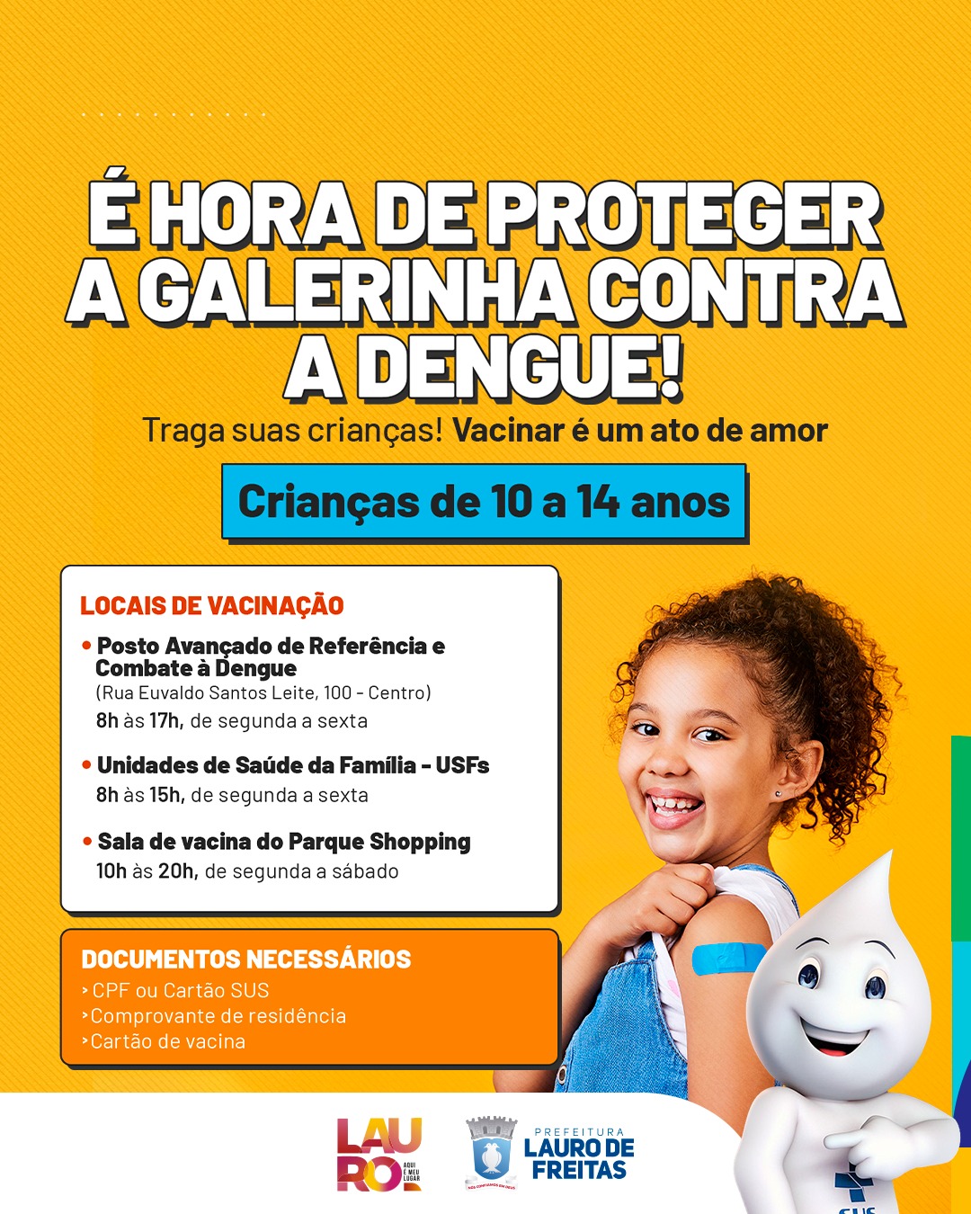 Os munícipes encontram a vacina contra a dengue no Posto Avançado de Referência de Combate à Dengue, que funciona no antigo PA Santo Amaro de Ipitanga, no Centro (em frente ao CEEPTIC), de segunda à sexta-feira, das 8h às 19h. Além do posto especializado, as vacinas também estão disponíveis em todas as Unidades de Saúde da Família (USFs), também de segunda à sexta, das 8h às 15h. Já na Sala de Vacina do Parque Shopping, o atendimento funciona de segunda à sábado, das 10h às 20h.