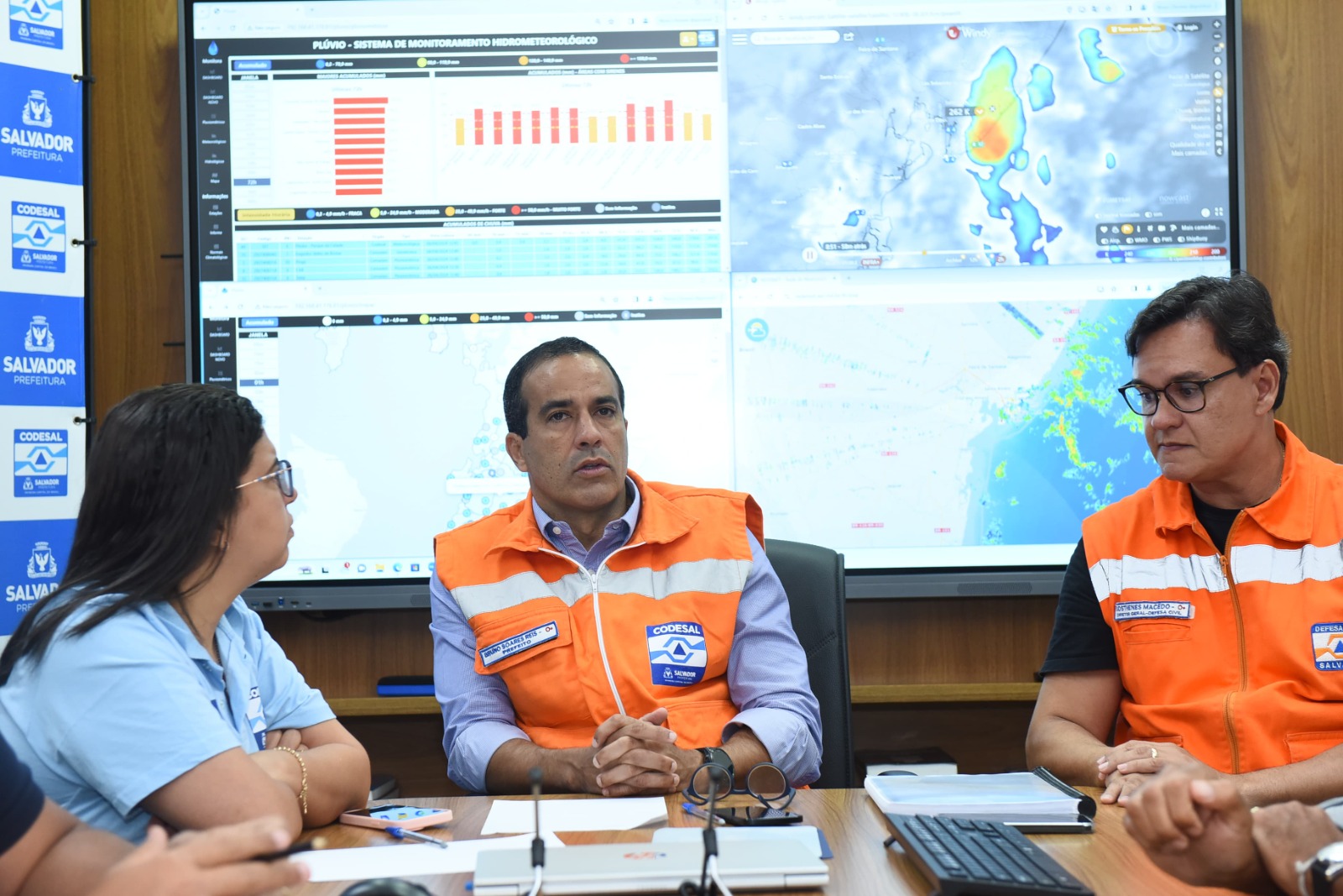 Na manhã desta segunda-feira (8), o prefeito Bruno Reis se reuniu com secretários e dirigentes que integram o Sistema Municipal de Defesa Civil, no Centro de Monitoramento de Alerta e Alarme da Codesal, para avaliar o cenário e as medidas que estão sendo adotadas para solucionar os problemas ocasionados pelas chuvas e dar suporte à população, principalmente aquela que vive em áreas de risco.
