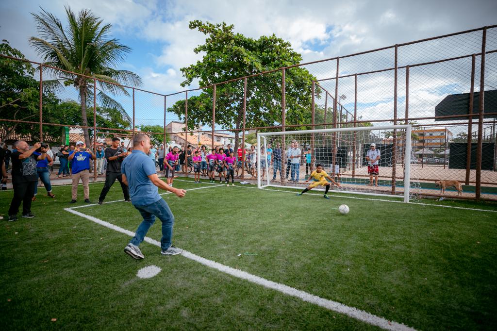 Na oportunidade, o prefeito Elinaldo Araújo contemplou toda a área com animação, verificando os detalhes e os novos elementos, aproveitou para usufruir dos espaços com os jogadores, chegando a lançar, do campinho de grama sintética, uma bola ao gol e rebater no campo de vôlei.