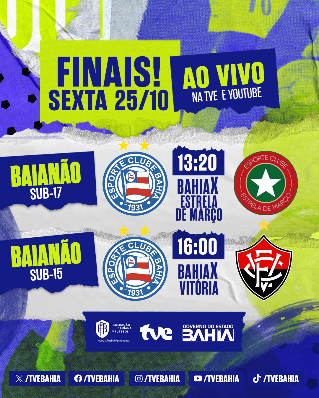 Os jogos de volta das finais do Sub-17 e do Sub-15 do Campeonato Baiano de Futebol acontecem nesta sexta-feira (25), com transmissão exclusiva da TVE. O Bahia e o Estrela de Março se enfrentam na categoria para jogadores de 16 e 17 anos a partir das 13h20 (pré-jogo). E em seguida, às 16h (pré-jogo), tem clássico com Bahia e Vitória disputando o título da categoria de 14 e 15 anos. Ambas as partidas acontecem no Estádio Reitor Edgard Santos, em Simões Filho (BA). Os torcedores podem assistir na TV e no Youtube.com/tvebahia