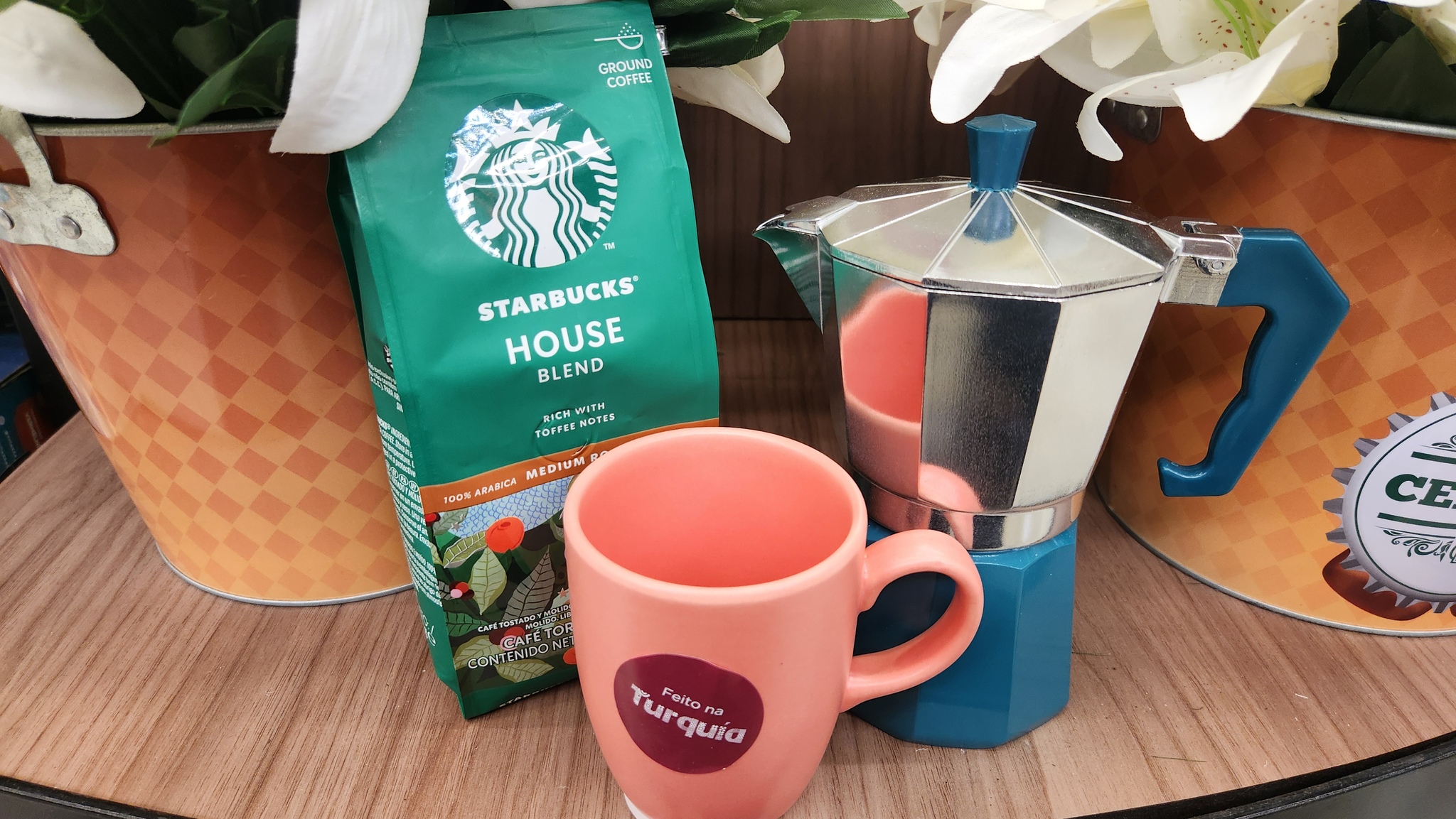 Kit Café: se a sua mãe é daquelas que só sai de casa com um café delicioso, essa opção de cafeteira italiana KREA para servir até 6 xícaras, com café Starbucks House Blend de 250g somada a uma caneca feita na Turquia, irá agradar todos os sentidos.