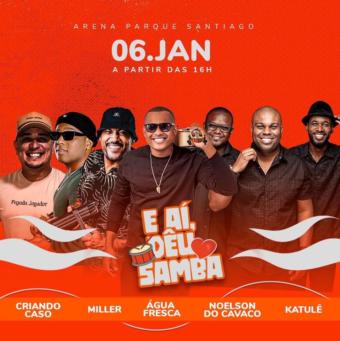 O E Aí Dêu Samba no Parque do próximo sábado (06/01), vai festejar com o melhor do samba, que está no coração e na cabeça do povo, a partir das 15h, na Arena Parque Santiago, traz para o palco os cantores Água Fresca, Noelson do Cavaco e Miller, e os grupos Criando Caso e Katulê, para agitar e não deixar ninguém parado na sua primeira edição do ano. O projeto dá oportunidade às bandas e artistas locais, para mostrarem seus talentos.