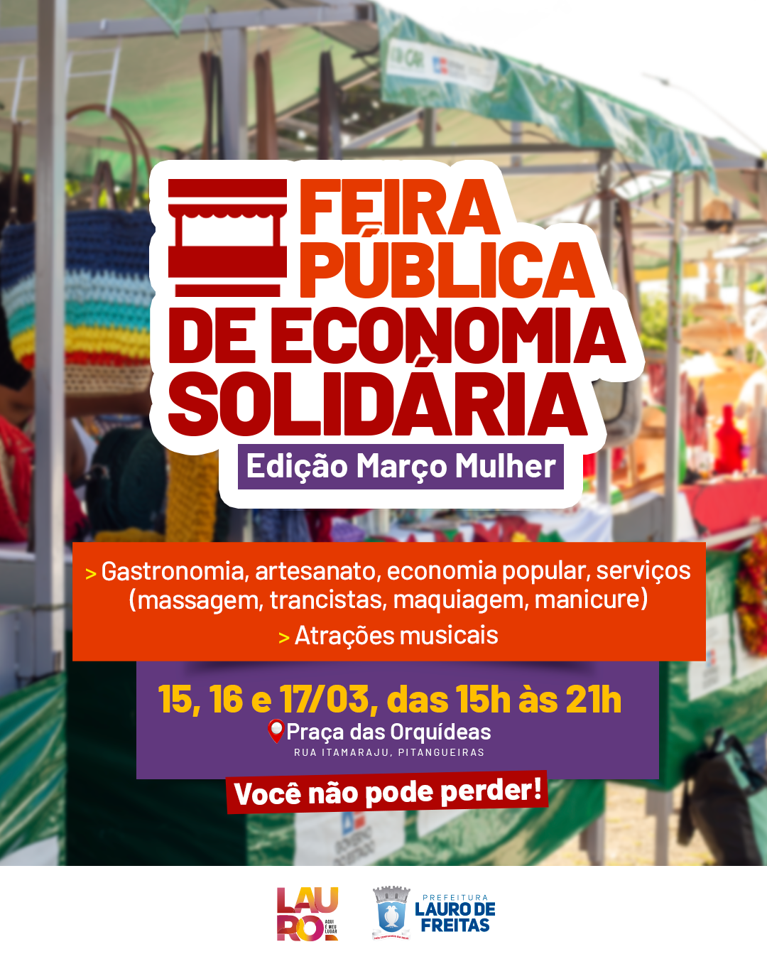 Em homenagem ao mês da mulher, a Prefeitura de Lauro de Freitas, por meio da Secretaria Municipal do Trabalho, Esporte e Lazer (SETREL), realiza a Feira Pública de Economia Solidária – Edição Março Mulher. O evento será na Praça das Orquídeas, localizada na Rua Itamaraju, no bairro de Pitangueiras, nesta sexta (15), sábado (16) e domingo (17), das 15h às 21h.