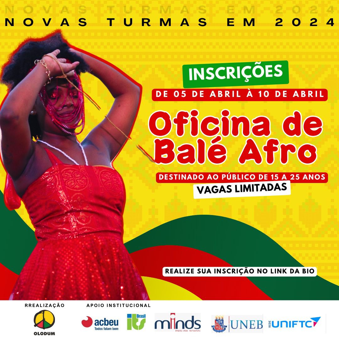 A Escola Olodum abre inscrições para oficina de dança gratuita para comemorar os 45 anos do Olodum e do mês da dança. Serão destinadas 30 vagas gratuitas, sendo 15 no turno matutino e 15 para o turno vespertino para pessoas de 15 a 25 anos, que estejam matriculados em alguma instituição de ensino, mediante comprovação da matrícula. A Oficina de Dança Afro e Expressão Corporal busca retomar as atividades na área de dança da Escola Olodum.