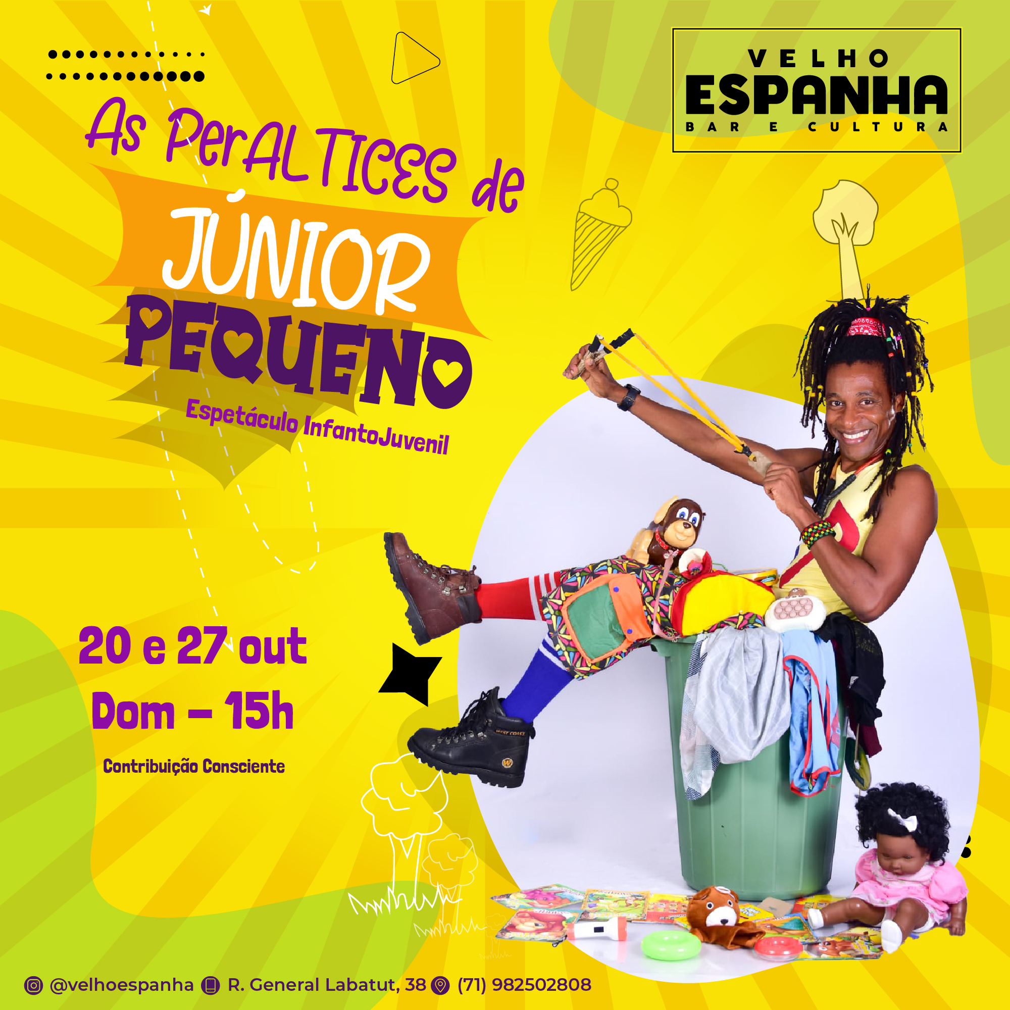 O espetáculo “As PerALTICES de JÚNIOR pequeno” será apresentado neste domingo (20) e no próximo (27), às 15h, no Velho Espanha, que fica nos Barris, em frente à Biblioteca Central. Será uma matinê. Os responsáveis poderão levar os seus filhos e dar uma contribuição consciente para o espetáculo. Ou seja, eles vão pagar o quanto puder. É o primeiro espetáculo infantojuvenil da história do bar.