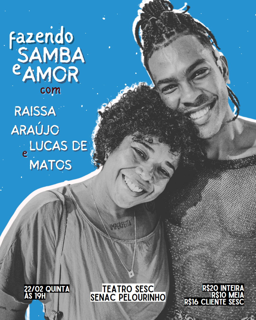 Um encontro de samba e poesia para celebrar o amor e suas diversas roupagens. Assim é a definição do espetáculo ‘Fazendo Samba & Amor’, apresentado pela cantora Raissa Araújo, e pelo poeta Lucas de Matos. O show acontece no Teatro do Sesc Senac Pelourinho, no dia 22 de fevereiro (quinta) às 19h, e reúne clássicos do samba e da música popular brasileira a um repertório autoral.