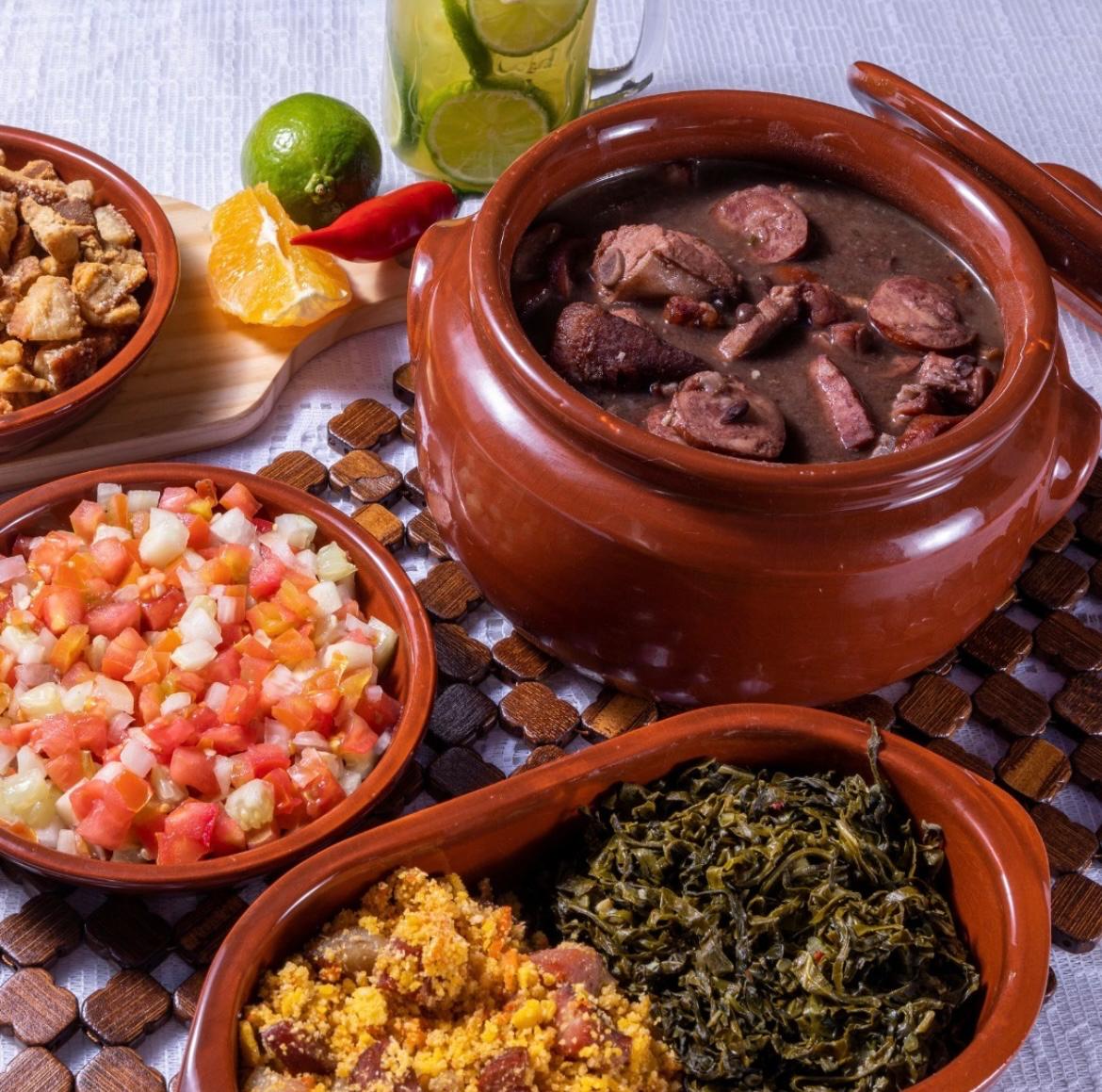 O buffet completo traz a clássica feijoada com feijão preto, bacon, costela suína, calabresa, paio, carne fresca, charque, pé, orelha e rabo, acompanhada de farofa, pimenta, torresmo, caldo de feijão, arroz branco e à grega, banana milanesa, aipim frito e couve refogada.