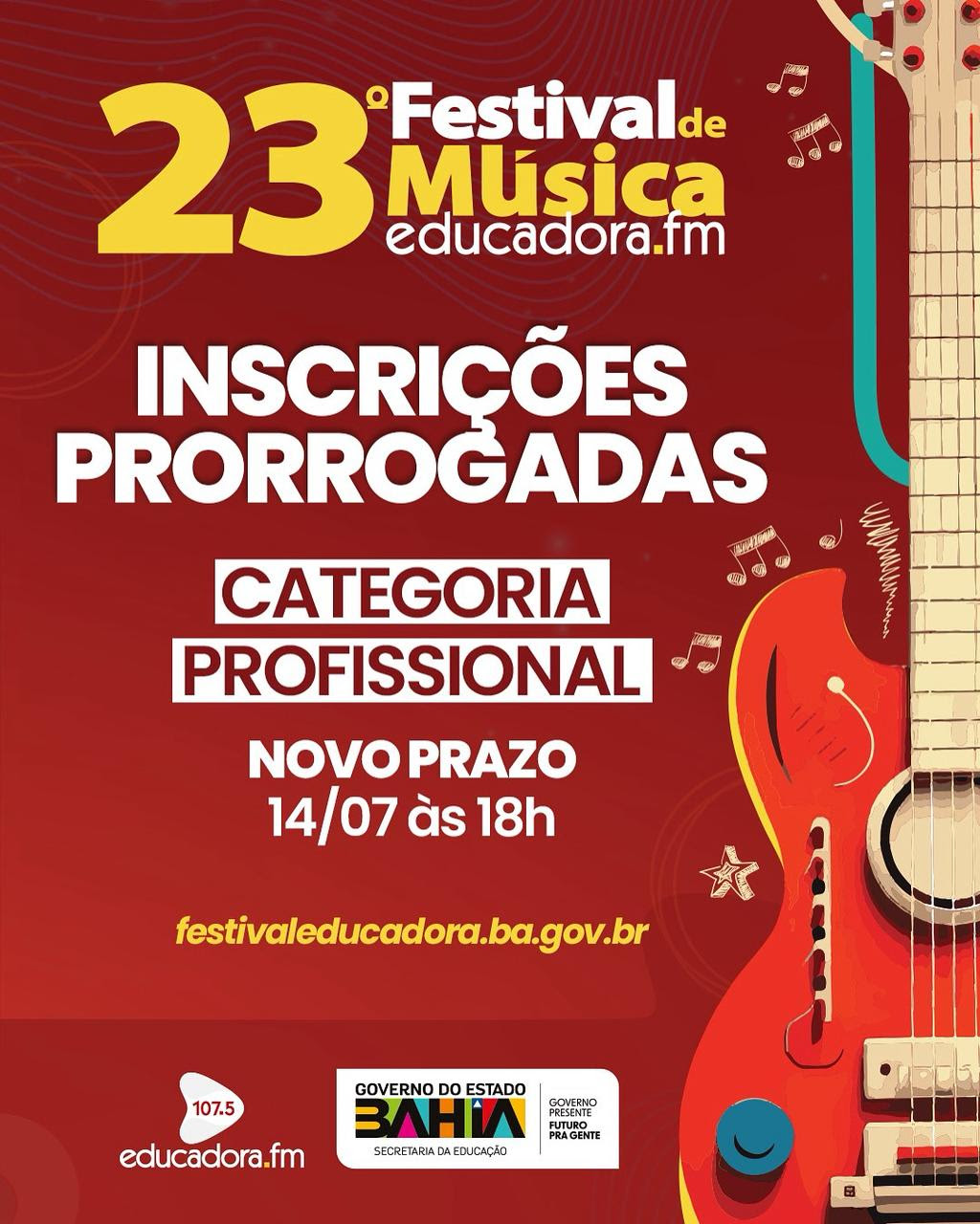 A inscrição para a categoria profissional da maior premiação da música independente da Bahia teve seu prazo estendido. Agora, os músicos e bandas que desejam concorrer no 23° Festival de Música da Rádio Educadora FM têm até o dia 14 de julho para participar. Já a categoria estudantil segue com o mesmo prazo de inscrições, abertas até o dia 1° de agosto. Os interessados deverão se inscrever através do site https://festivaleducadora.ba.