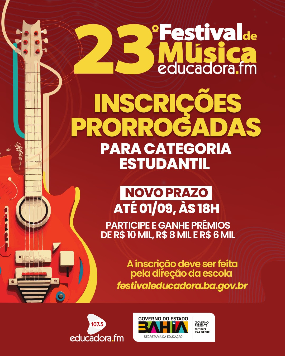 Estudantes da Rede Estadual de ensino que desejam participar do 23° Festival de Música da Rádio Educadora FM agora têm até o dia 1° de setembro para inscrever a sua música e a concorrer a prêmios. Os interessados devem se inscrever através do site https://festivaleducadora.ba. gov.br/. Aos jovens talentos estudantis serão concedidos três prêmios: R$10 mil para o primeiro lugar, R$8 mil para o segundo lugar, e um prêmio de R$6 mil para o terceiro lugar. As músicas premiadas na categoria estudantil também serão tocadas na programação da Rádio Educadora FM.