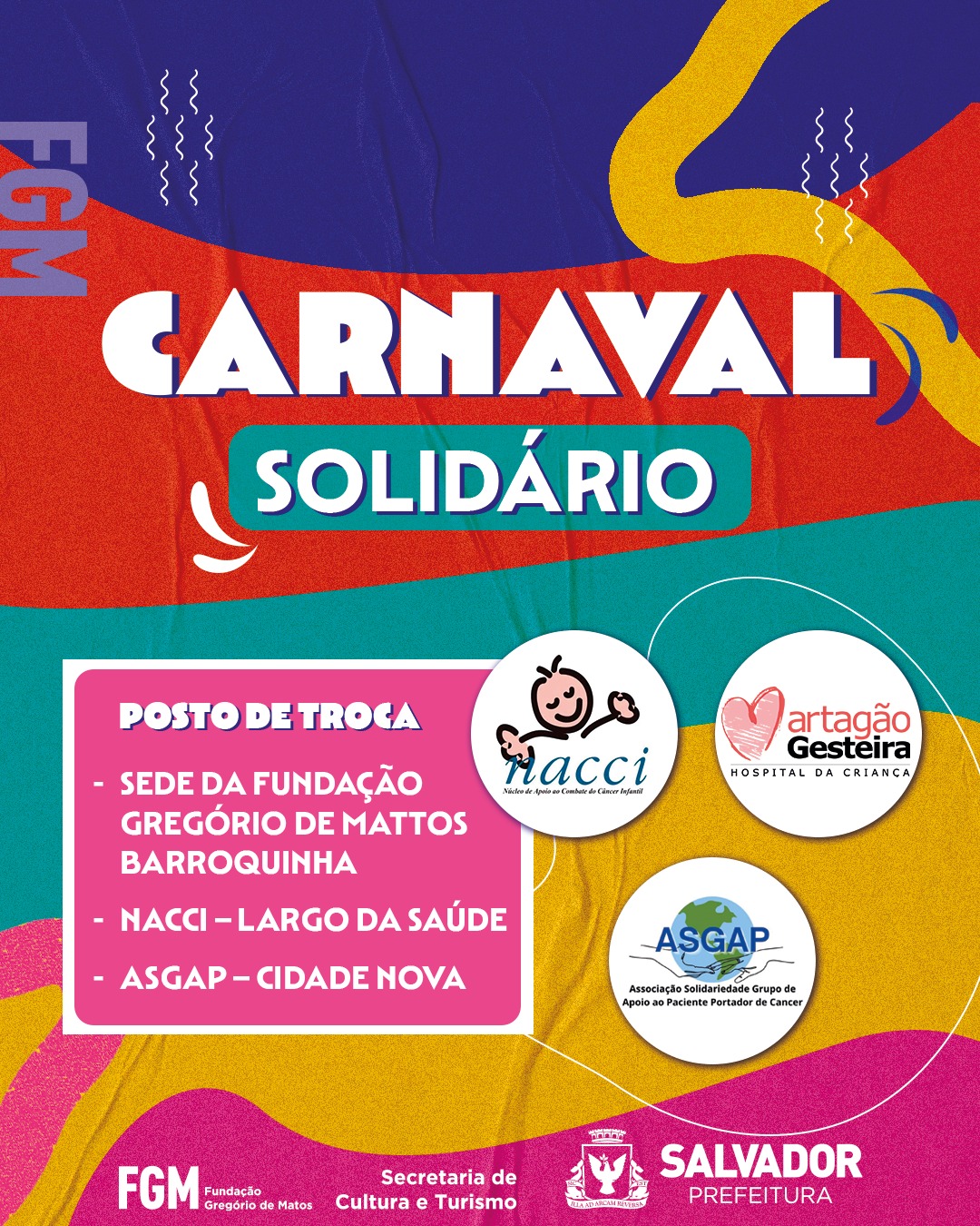Apoiado pela Prefeitura de Salvador, através da Fundação Gregório de Mattos (FGM), o Carnaval Solidário oferecerá, em mais um ano, a oportunidade para que os foliões ajudem instituições que prestam apoio a pacientes com câncer. O projeto, promovido pelo Bloco Cultural, agremiação criada por servidores municipais, permite a troca de alimentos não perecíveis por abadás, e tem como objetivo arrecadar doações para beneficiar o Núcleo de Apoio ao Combate do Câncer Infantil (Nacci), o Grupo Apoio ao Paciente Portador de Câncer (Asgap) e o Hospital Martagão Gesteira (HMG).