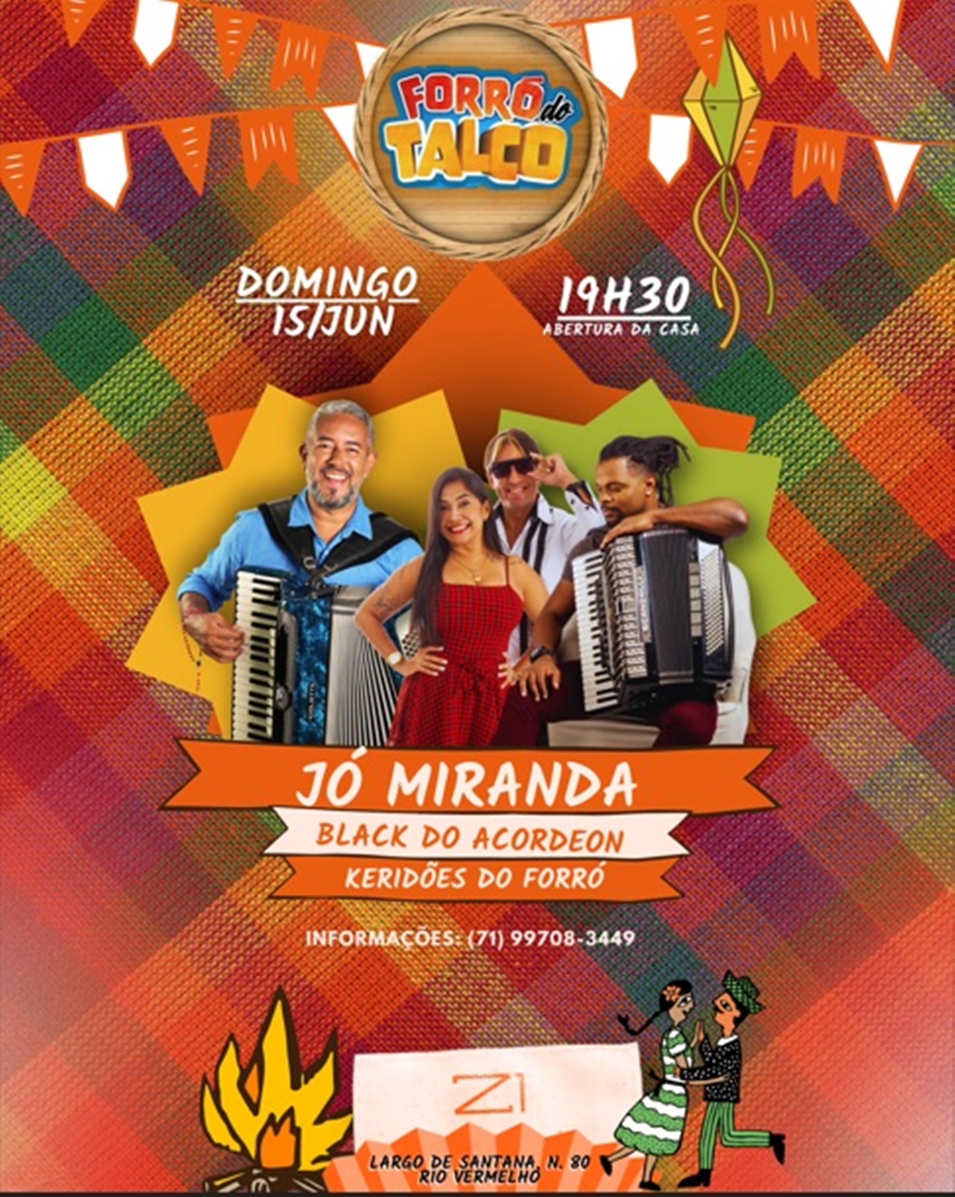 Neste domingo, 15 de junho, o Forró do Talco promove mais uma edição no espaço Z1, no Largo de Santana, no Rio Vermelho, com abertura da casa às 19h30. Criado em 2011 pelo cantor e compositor Jó Miranda, o evento é o único de forró tradicional com programação semanal em Salvador.