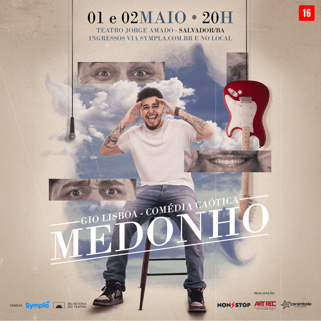 Em turnê pelo Brasil, um dos ícones do humor da nova geração, fenômeno na internet e nos palcos, Gio Lisboa chega à Salvador para apresentação do espetáculo de comédia, “MEDONHO”. A apresentação acontece nos dias 01 e 02 de maio (quarta e quinta), às 20h, no Teatro Jorge Amado. Os ingressos podem ser adquiridos na bilheteria do teatro ou através do site da Sympla.