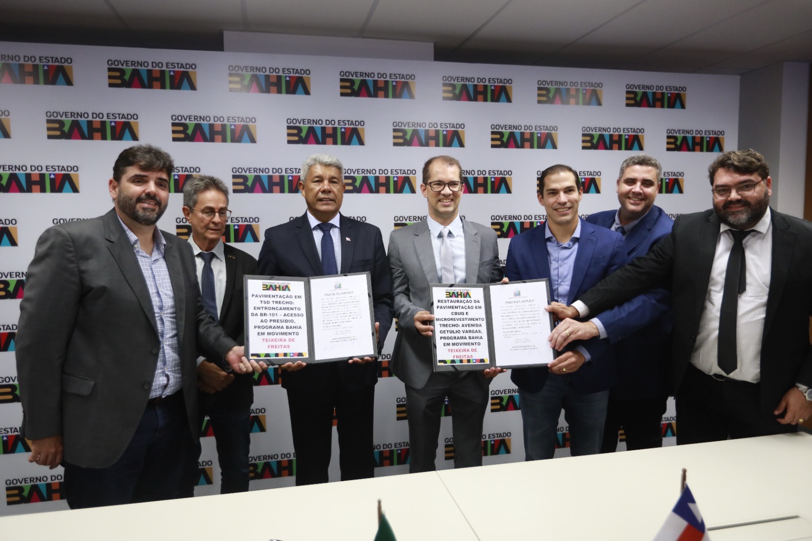 Duas importantes obras de infraestrutura em Teixeira de Freitas, no Extremo Sul da Bahia: a pavimentação do trecho que liga a BR-101 ao Presídio de Teixeira de Freitas e a restauração de 1,5 quilômetro da Avenida Getúlio Vargas, já têm data para começar. A autorização foi assinada na tarde desta quinta-feira (10), no gabinete do governador Jerônimo Rodrigues, em Salvador, com a presença do prefeito do município, Marcelo Belitardo e do superintendente de Infraestrutura de Transportes da Bahia, Saulo Pontes. O investimento total das intervenções é de R$ 7 milhões.