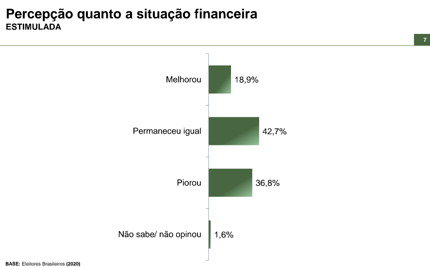 A pergunta feita para os eleitores foi: “Com o Presidente Lula no Governo a sua situação financeira e da sua família melhorou, piorou ou permanece igual?”. Na pesquisa, 36,8% dos entrevistados indicaram que a situação piorou, enquanto 18,9% afirmou que a situação melhorou.