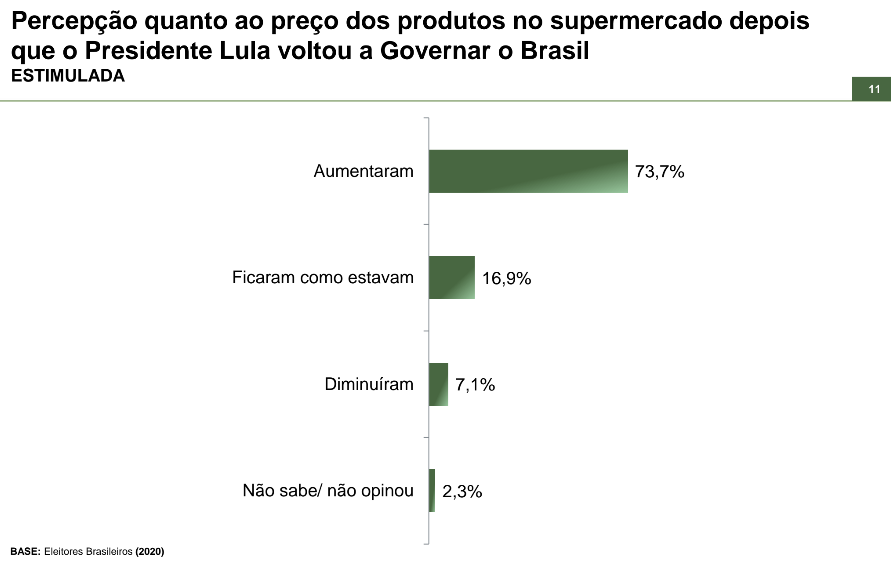 A segunda pergunta feita na entrevista foi relacionada a percepção quanto ao preço dos produtos no supermercado depois que o Presidente Lula voltou a Governar o Brasil. Cerca de 73,7% dos eleitores indicaram um aumento no preço dos produtos.