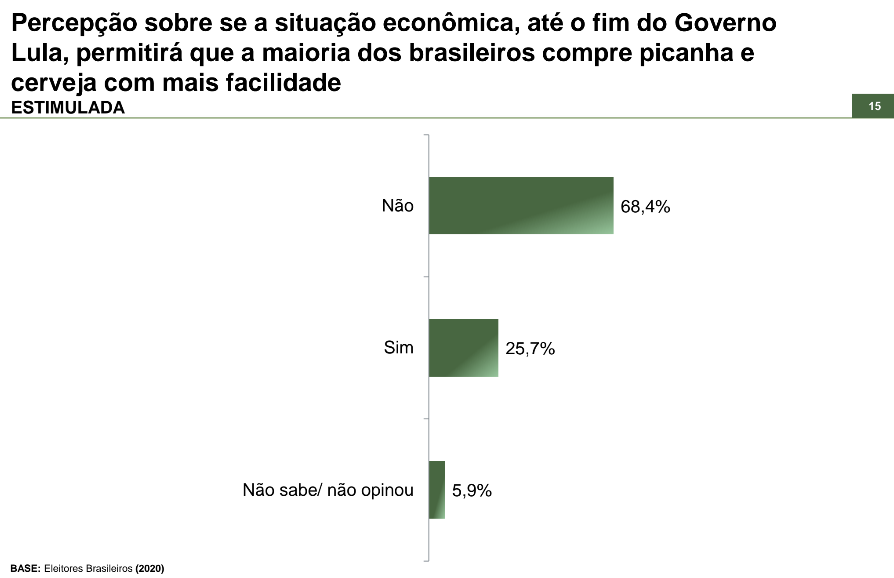 O último questionamento feito pela pesquisa foi se a população acreditava que até o fim do Governo Lula, “a situação econômica permitirá que a maioria dos brasileiros compre picanha e cerveja com mais facilidade?”.