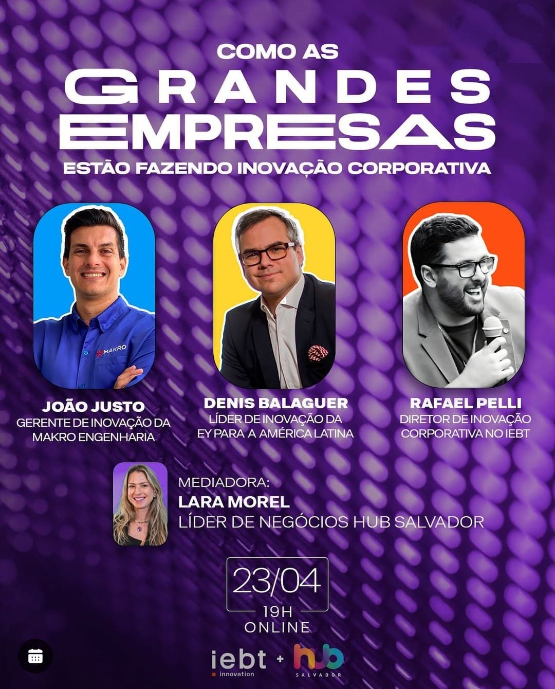 O evento vai contar com um time de especialistas, como Rafael Pelli, Diretor de Inovação corporativa no IEBT; Denis Balaguer, Líder de Inovação da EY para a América Latina; e João Justo, Gerente de Inovação da Makro Engenharia; além da mediação de Lara Morel, Líder de Negócios do Hub Salvador. As inscrições podem ser feitas através do Sympla (https://www.sympla.com.br/