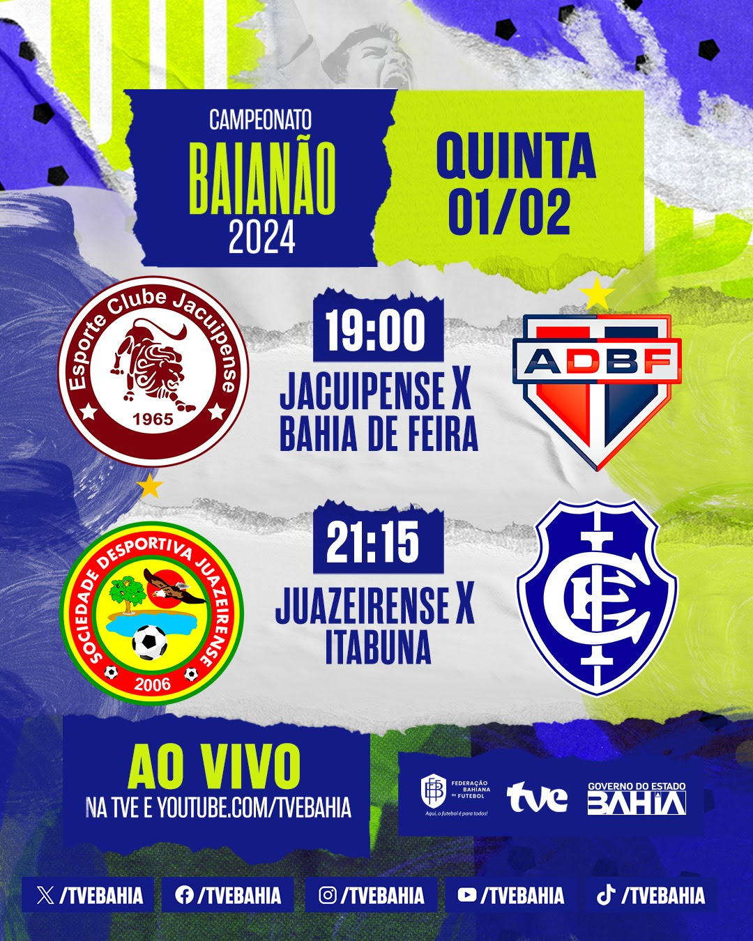 Nesta quinta (01), a quinta rodada do Campeonato Baiano continua na tela da TVE. Às 19h (pré-jogo) o Jacuipense encara o Bahia de Feira, no Estádio Eliel Martins, em Riachão do Jacuípe. Já às 21h15 (pré-jogo), o Juazeirense duela contra o Itabuna, no Estádio Adauto Moraes, em Juazeiro. Os torcedores também podem acompanhar as partidas pelo Youtube.com/tvebahia.