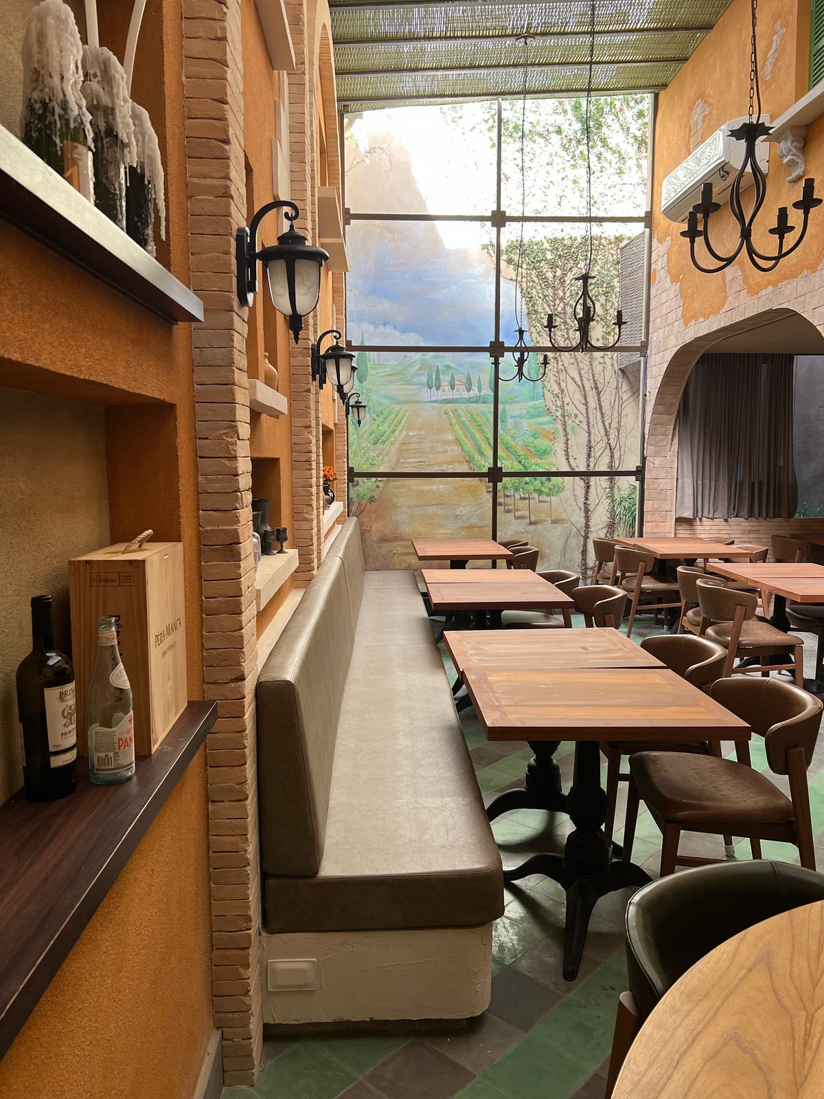 A atmosfera do di Giuseppe é um espetáculo à parte. O projeto arquitetônico, assinado por Thulio Rodrigues, respeita e valoriza a estética clássica, enquanto o artista George Pereira dá vida às paredes do restaurante com pinturas que transportam os clientes para paisagens inspiradas nas regiões centrais da Itália, como Lácio e Toscana.