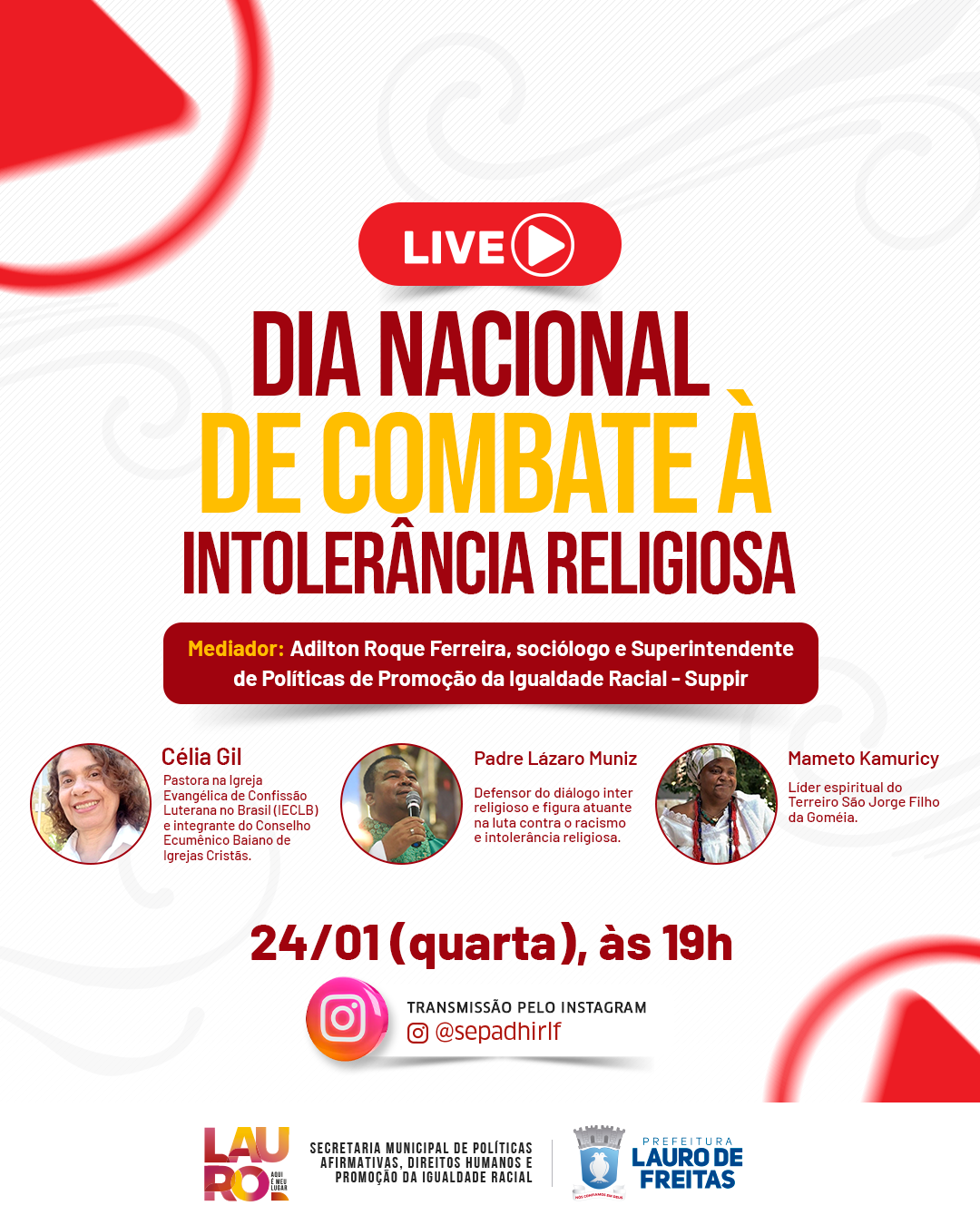 A Secretaria Municipal de Políticas Afirmativas, Direitos Humanos e Igualdade Racial (SEPADHIR), por meio da Superintendência de Políticas de Promoção da Igualdade Racial (SUPPIR), realiza nesta quarta-feira (24), uma live para celebrar o Dia Nacional de Combate à Intolerância Religiosa.