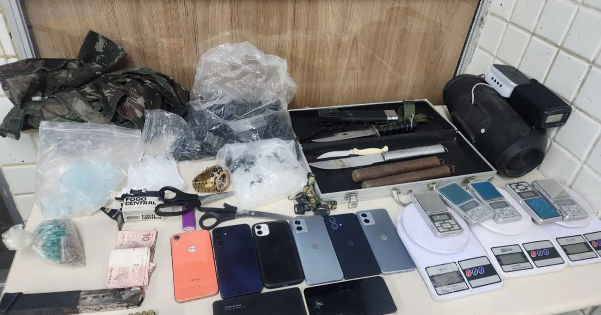 Com ele, foram encontrados um carregador de pistola alongado, 50 munições calibre 9mm, 49 frascos contendo K9, 20 pedras de crack, quatro pacotes de maconha, oito balanças de precisão, três facas, sete celulares, três chaves de moto e materiais comumente utilizados no fracionamento e comercialização de drogas.