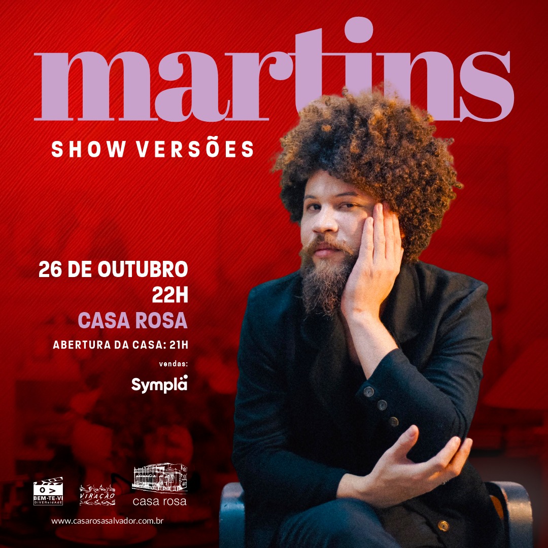 Faz tempo que o público de Salvador pede por um show de Martins e a data está marcada: no dia 26 de outubro (sábado), às 22h, a Casa Rosa recebe o cantor e compositor pernambucano no show “Versões”, em que interpreta suas músicas preferidas. Ingressos estão à venda pela plataforma Sympla.