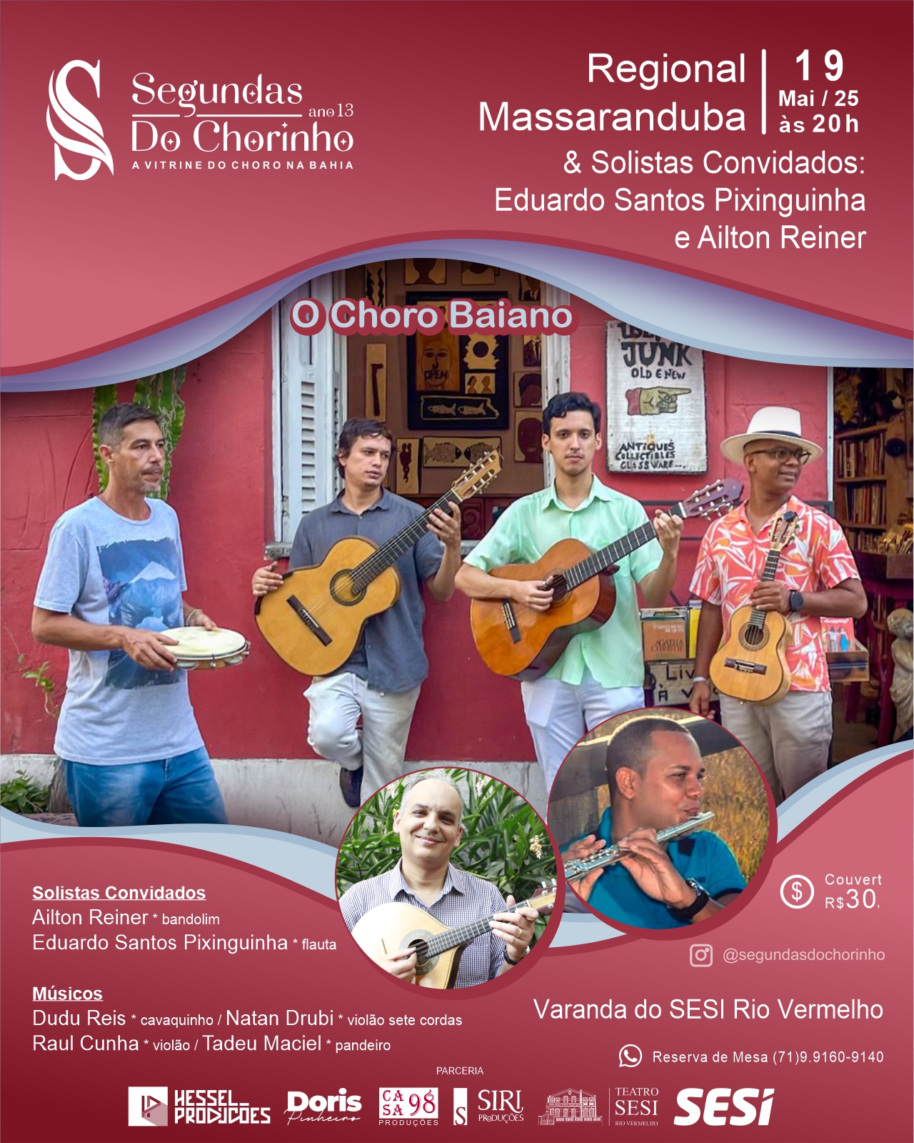 Na noite de 19 de maio de 2025, a partir das 20h, o Projeto Segundas do Chorinho – Ano 13 recebe o Regional Massaranduba e dois convidados especiais: o bandolinista Ailton Reiner e o flautista Eduardo Santos Pixinguinha. O encontro acontece na Varanda do SESI Rio Vermelho e promete ser uma verdadeira celebração da tradição e da renovação do choro feito na Bahia.