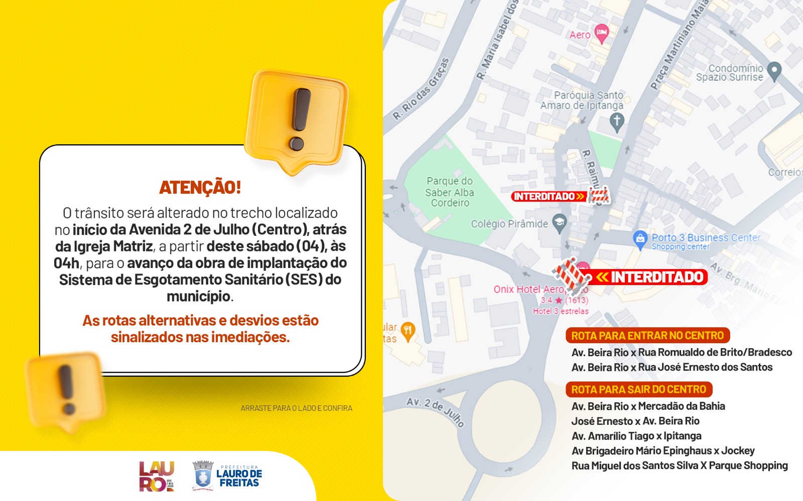As interdições começam no fundo da Igreja da Matriz, nos sentidos Salvador e Centro de Lauro de Freitas. Para seguir em direção ao Centro, o motorista também tem como opção a Avenida Beira Rio, seguindo pelas rua Romualdo de Brito (onde tem o Bradesco) e José Ernesto dos Santos. No sentido contrário, saindo do Centro, os motoristas terão como opções a Avenida Beira Rio x Mercadão; a Rua José Ernesto dos Santos x Avenida Beira Rio; Avenida Amarílio Tiago x Rua Ipitanga; Avenida Brigadeiro Mário Epinghaus x Parque Jockey Clube; e Rua Miguel dos Santos Silva x Parque Shopping Bahia.
