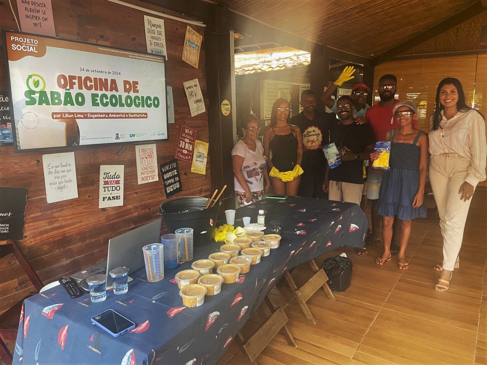 A fim de envolver a comunidade de Guarajuba em uma iniciativa sustentável e educativa, a equipe social do Programa de Integração e Desenvolvimento Urbano, Social e Ambiental de Camaçari promoveu uma oficina de sabão ecológico na localidade. A ação faz parte das atividades de requalificação urbana da região, executadas pela Prefeitura de Camaçari, por meio da Secretaria da Infraestrutura (Seinfra), em parceria com o CAF – Banco de Desenvolvimento da América Latina e Caribe.