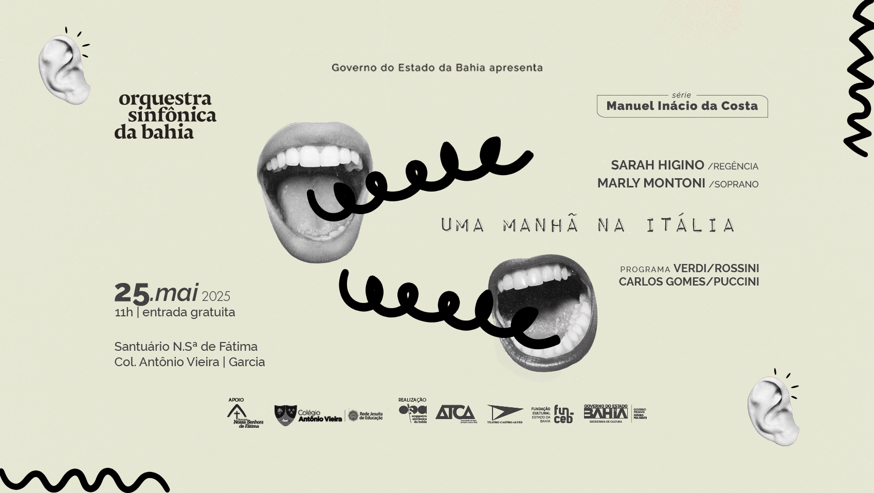 A Orquestra Sinfônica da Bahia apresenta neste domingo (25/05), às 11h, o concerto “Uma Manhã na Itália”, que acontece no Santuário Nossa Senhora de Fátima, localizado no Colégio Antônio Vieira, no bairro do Garcia. No evento, a OSBA contará com a regência da maestra convidada Sarah Higino e solo da soprano Marly Montoni, em um programa dedicado a compositores italianos. A entrada é gratuita, sujeita à lotação do espaço, que possui estacionamento gratuito.