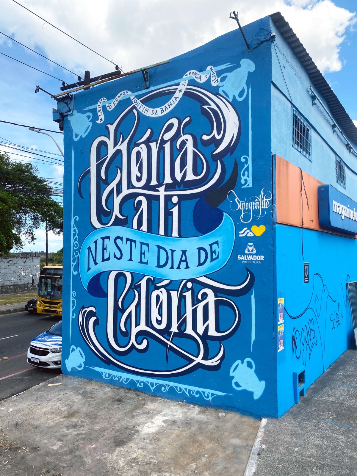 Criada em 2018, a pintura rapidamente tornou-se uma das atrações do trajeto de 8 km entre o Comércio e a Colina Sagrada, parada para as ‘selfies’ de milhares de participantes. A obra tem 28 m² e traz a célebre frase “Glória a ti neste dia de glória”, presente no Hino ao Senhor do Bonfim, totalmente estilizada pelo artista, que assina como Tipografite.