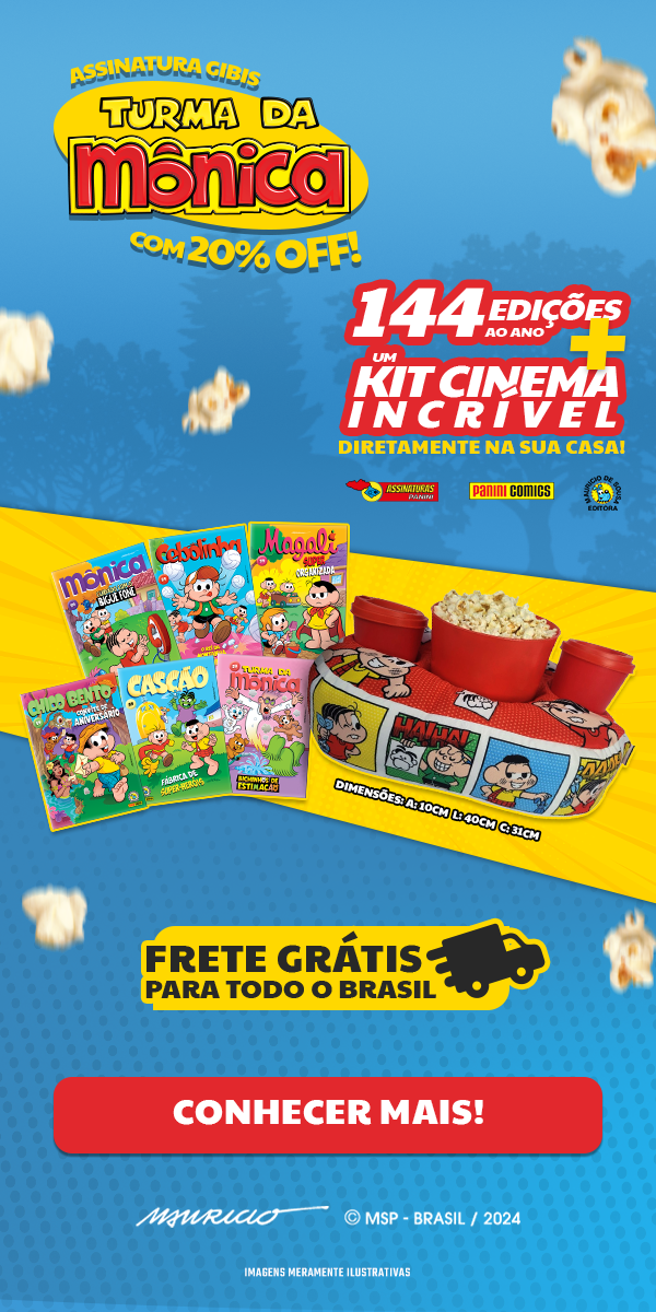 A Panini, líder mundial em publicações, anuncia uma emocionante novidade para os leitores da Turma da Mônica que optarem pelo Pacote Gibis, na modalidade Assinaturas da editora. Este pacote anual oferece 20% de desconto e inclui 6 envios quinzenais, ao longo dos meses, totalizando 144 edições ao longo do ano. Como brinde especial, os assinantes receberão de presente um Kit Cinema da Turma da Mônica, uma linda almofada porta pipoca, dois copos plásticos e um balde para pipoca, ideal para desfrutar das aventuras da Turminha com conforto e estilo.