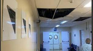 Uma placa de gesso do forro se encheu de água e desabou, mas ninguém ficou ferido. De acordo com a secretaria, quando as goteiras começaram, os pacientes foram removidos para outras partes do hospital.